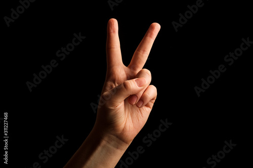 Hand Showing Sign of V Alphabet in American Sign Language (ASL), isolated on black background. Sign language