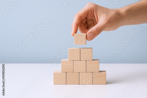 Hand stacking wooden blocks on a white surface creating a pyramid structure.
