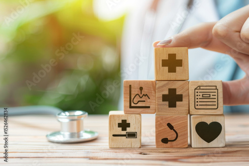 Hand stacking wooden blocks with health symbols against a blurred green background with a stethoscope.