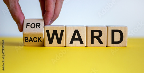 Hand turns a cube and changes the word 'backward' to 'forward' on wooden cubes. Beautiful yellow table, white background, copy space.