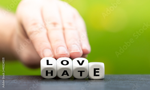 Hand turns dice and changes the word hate to love.