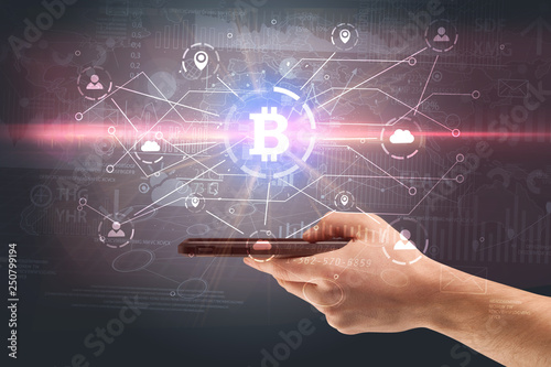 Hand using phone with cryptocurrency bitcoin link network and online concept