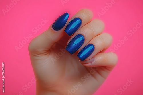 Hand with long, glossy blue metallic nails against a vibrant pink background, showcasing elegant nail art and polished manicure