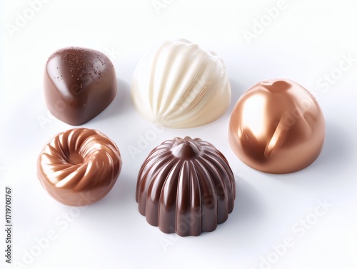 Handcrafted Chocolate Pieces, White Background, Clean Product Photography, Soft Shadows, Realistic Textures, Minimalist Composition