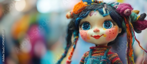 Handcrafted colorful doll showcased at lively trade fair highlighting creativity and unique collectibles in custom toy craftsmanship
