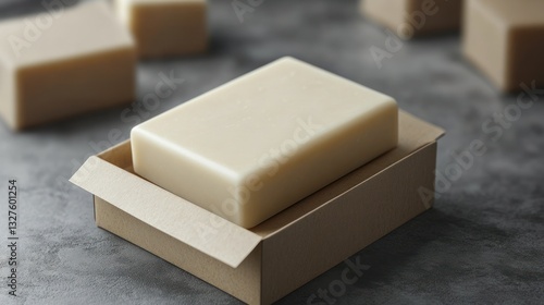 Handcrafted natural soap bar in eco-friendly packaging, placed on a textured dark surface with a minimalist and organic aesthetic. Ideal for branding, skincare advertisements, beauty product.