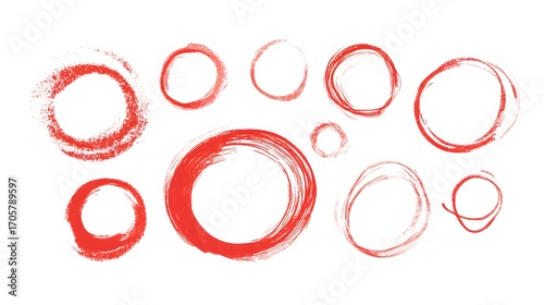 Hand-drawn brush set collection red and black circles with sketchy lines on white background.