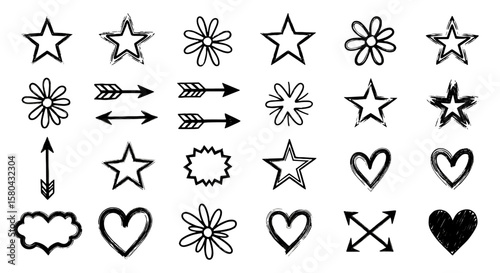 Hand-Drawn Doodle Icon Set – Stars, Hearts, Arrows, Flowers, and Speech Bubbles in Black and White
