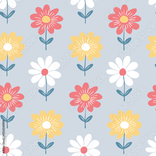 Hand-drawn Floral Seamless Pattern with Daisies and Leaves – Vintage Botanical Design