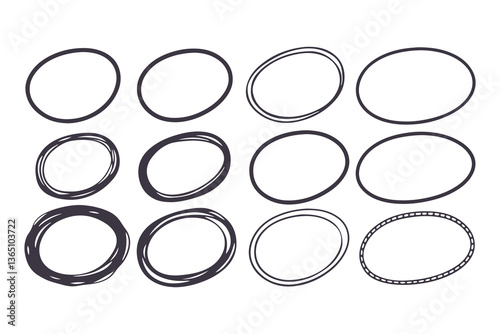 Hand-Drawn Ink Circles and Ovals Set Sketchy, Imperfect Doodle Style with Varying Sizes and Proportions, Casual Marker-Like Strokes for Artistic and Organic Designs