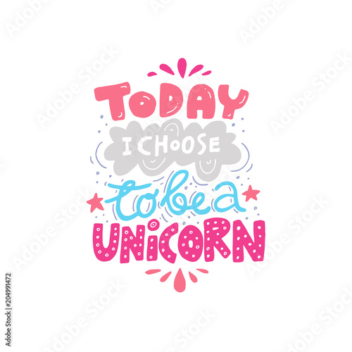 lettering, unicorn, magic, cute, adorable, cartoon, today, choose, be, vector, happy, pretty, imagination, fairy tale, fantasy, doodle, freehand, hand-drawn, vignetting, isolated, element, illustration, design, banner, unique, concept, symbol, drawing, typography, type, script, phrase, word, brush, calligraphic