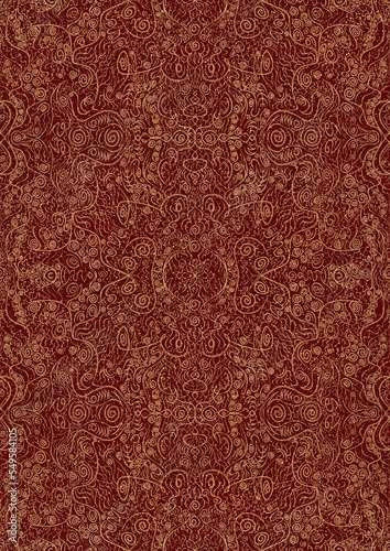 Hand-drawn unique abstract symmetrical seamless gold ornament and splatters of golden glitter on a deep red background. Paper texture. Digital artwork, A4. (pattern: p06d)