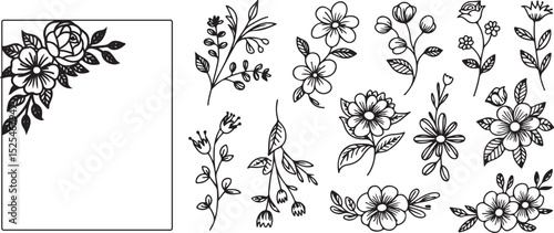 flower, floral, illustration, botanical, vignetting, vintage, hand-drawn, rose, drawing, set, border, decoration, design, nature, black-and-white, line art, isolated, collection, decorative, leaf, plant, doodle, elegant, wedding, invitation, bloom, corner, frame, engraving, retro, blossom, garden, beautiful, summer, spring, outline, element, monochrome, classic, romantic, ornament, organic, simple, daisy, wildflower, art, ink, tattoo, template