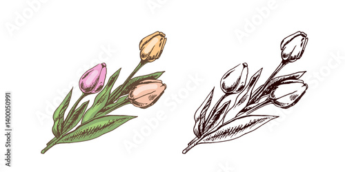 Hand-drawn vintage colored and black sketch of bouquet of tulips. Easter Holiday. Vector illustration. Flowers. Drawing isolated on white background. Vintage element.