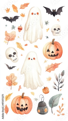 Hand-drawn watercolor Halloween elements like pumpkins, skulls, and autumn leaves.