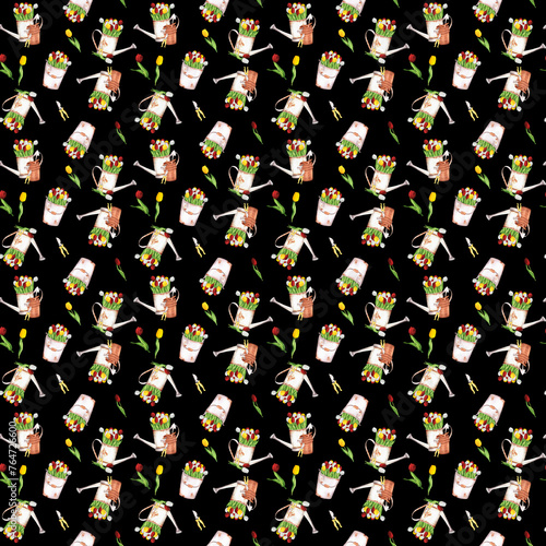 Hand-drawn watercolor illustration. Seamless pattern with garden watering can, yellow, red and white tulips, garden buckets, flowerpots and garden tools