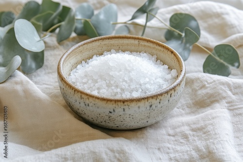 Handmade ceramic bowl with sea salt and eucalyptus leaves