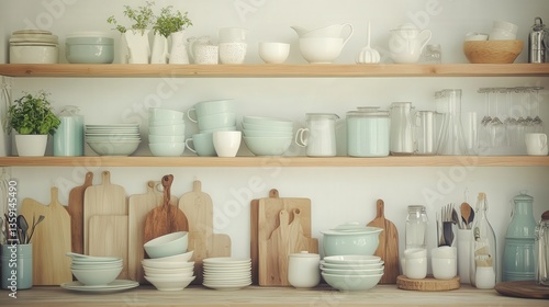 wooden, shelf, hand-made, item, isolated, white, background, pastel, colours, art, style, raw, rustic, arrangement, kitchen, decor, display, minimalistic, simple, organisation, home, aesthetic, contemporary, lifestyle, storage, pottery, ceramic, glasses, utensil, fresh, natural, green, plant, bowl, plate, cup, jar, cutting, board, collection, craft, artistic, design, space, environment, beautiful