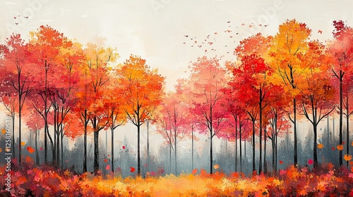 Hand-painted landscape of colorful autumn trees with semi-abstract forest elements for creative decor.