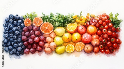 hand, painted, watercolor, poster, fruit, blueberry, grape, orange, apple, cherry, tomatoes, freshness, colours, nature, organic, healthy, diet, harvest, garden, arrangement, artistic, culinary, vibrant, juicy, seasonal, decoration, design, creative, visual, illustration, texture, still life, unique, delicate