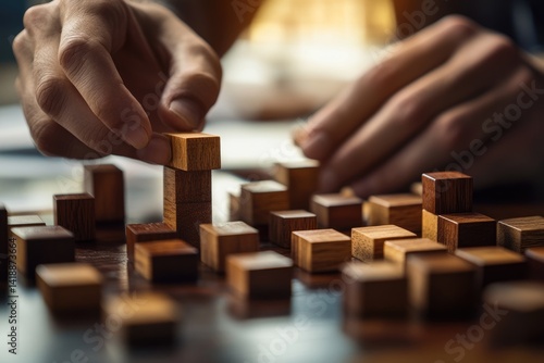 Hands carefully placing wooden blocks, building a complex structure, symbolizing strategic planning and problem-solving.
