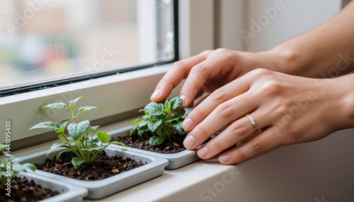 Hands caring for small plants by a window.
