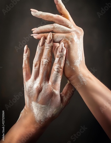 Hands covered in white powder create an artistic expression in a dark setting with focused lighting