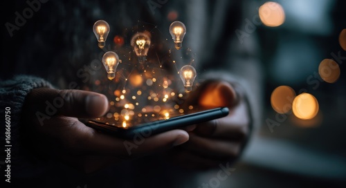 hand, phone, light, bulb, idea, innovation, digital, technology, screen, bokeh, shimmer, glow, mobile, communication, future, creativity, invention, concept, smartphone, device, dark, glowing, holding, networking, electricity, energy, power, cognition, wisdom, brilliance, intelligence, imagination, solution, business, success, inspiration, bright, spark, abstract, sharpened, connection, cyberspace, sharing, wireless, online, information, progress