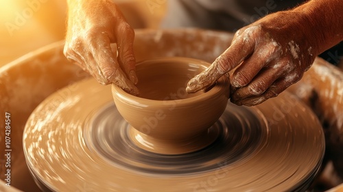 Hands crafting a clay bowl on a pottery wheel in warm light.
