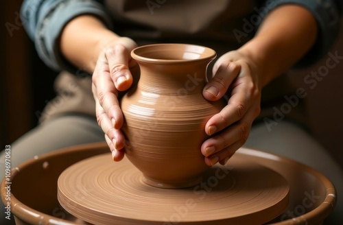 Hands crafts a vase on a potter's wheel using brown clay. Close-up of fingers shape the oval vase, creating a sense of motion and depth. Potter at work