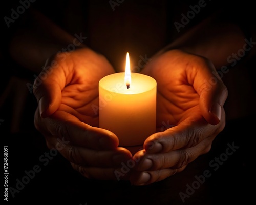 Hands cupping a single lit candle flame warmth and hope