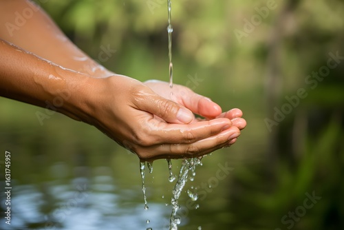 water, hand, cupping, clean, flowing, outdoors, nature, fresh, purity, hydratation, refreshment, droplet, stream, liquid, transparent, clear, healthy, life, wellness, agriculture, drinking, washing, conservation, resource, environment, organic, sustainability, environmentally friendly, care, gentle, delicate, skin, touch, feeling, summer, spring, warm, day, sunlight, background, green, lush, leafy, bokeh, serene