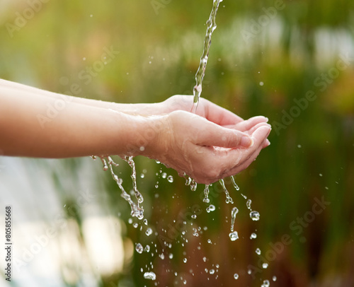 Hands, fresh water and stream with splash or serenity with calm in outdoors with palm. Wellness, spring and sunshine with health or clean river with respect for nature with spirituality at lake
