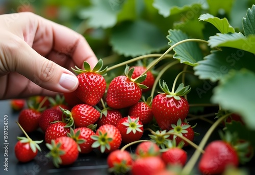 Hands gently picking plump, red strawberries from the plant, showcasing freshness and abundance.