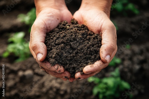 Hands gripping soil for planting with space for text