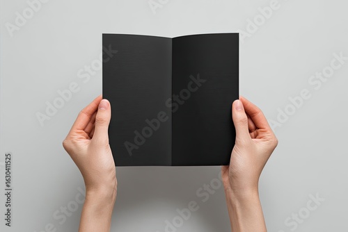hand, booklet, black, blank, paper, open, holding, document, empty, print, design, template, presentation, marketing, advertising, flier, fold, printed, promotional, material, grey, surface, top, view, flat, modern, minimal, simple, editorial, promo, information, communication, product, style, light, elegant, neutral, empty space, illustration, graphic