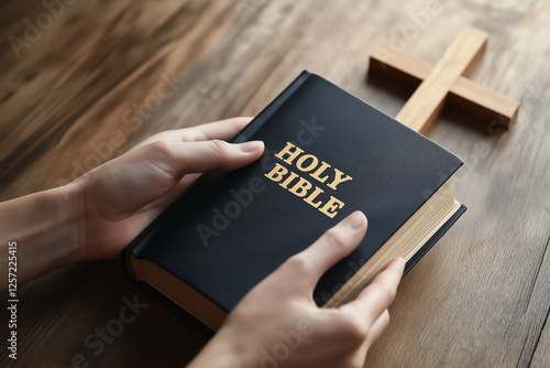 hands hold the book “HOLY BIBLE”, in the church, a wooden cross lies nearby. Prayer and spirituality concept.