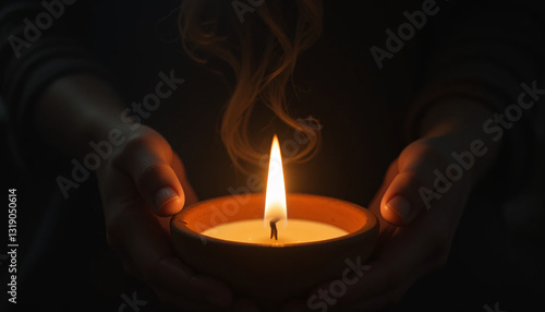 Hands Holding a Lit Candle with Rising Smoke Against a Dark Background