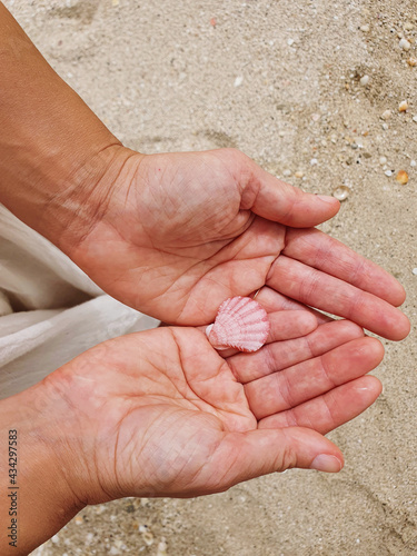 pink, beach, holding, environmental conservation, hand, seashell, hand