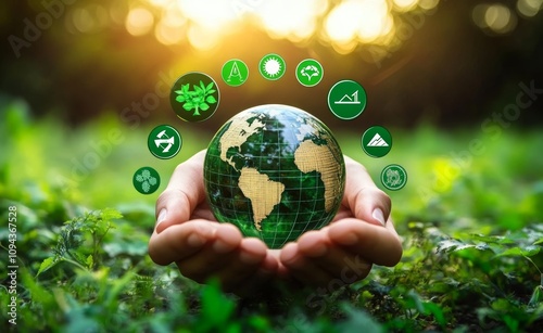 Hands Holding Transparent Globe with Environmental Icons, Focus on Renewable Resources and Sustainability