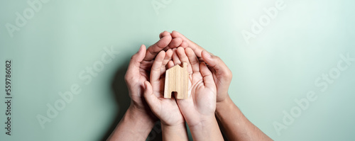 Hands holding wooden house, family home, homeless housing, mortgage crisis and home protecting insurance, international day of families, foster home care, family day care, stay home concept