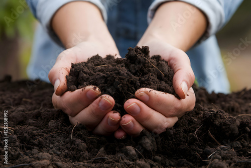 pair, hand, clad, blue, shirt, delicately, holding, rich, dark, dirtied, moist, texture, background, blurred, gardening, farming, setting, nature, earthy, organic, nurturing, growth, environment, cultivated, freshness, planting, care, agriculture, touch, sustainability, effort, fertile, palm, connection, working, root, preparation, landscape