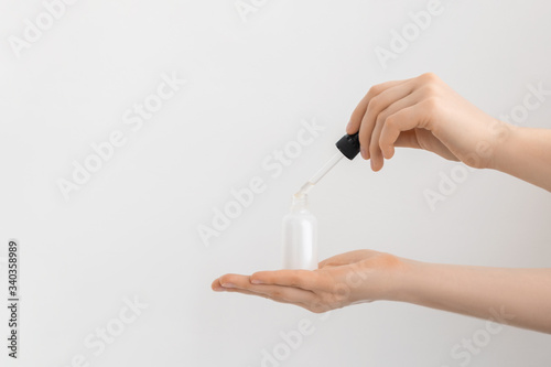 Hands of a beautiful woman dripping serum collagen moisturizer of face into clear white bottle soft light, grey background.