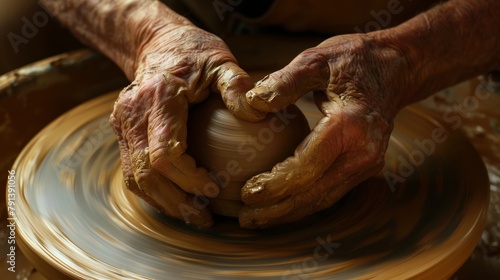 Hands of a potter at work, centering a clay ball on a pottery wheel, intimate focus on hand movements and clay texture