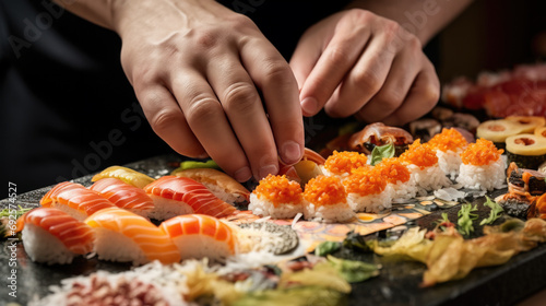 photo, horizontal, color image, sushi, freshness, japanese food, food, seafood, one person, people, chef, japanese culture, indoor, closeup, food and drink, epicure, human hand, preparation, raw food, making, healthy eating, ingredient, part of, cooking, dinner, eatery, kitchen, adult, meal, fish, adults only, one man only, japan, fine dining, sashimi, lifestyle, tradition