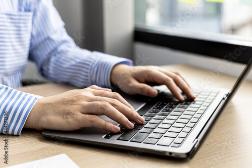 Hands of businesswoman typing on a laptop keyboard, she is using a messaging program to talk to a business partner who is opening a startup company. Concept of using technology in communication.
