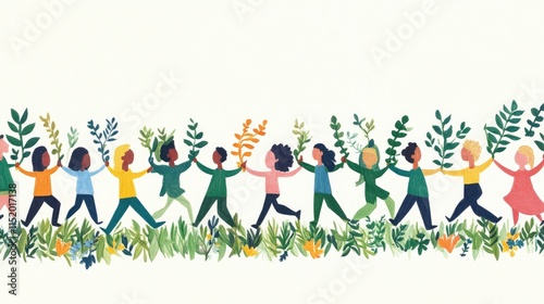 Hands of diverse individuals lifting a connected paper chain of people, emphasizing community and shared goals.