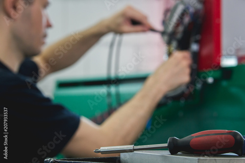 Hands of electrician engineer screwing and testing equipment in fuse box, de-focused