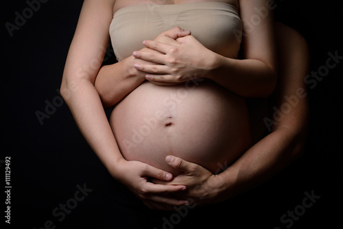 hands of pregnant woman and her husband on belly