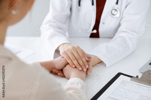 Hands of unknown woman-doctor reassuring her female patient, close-up. Medicine concept
